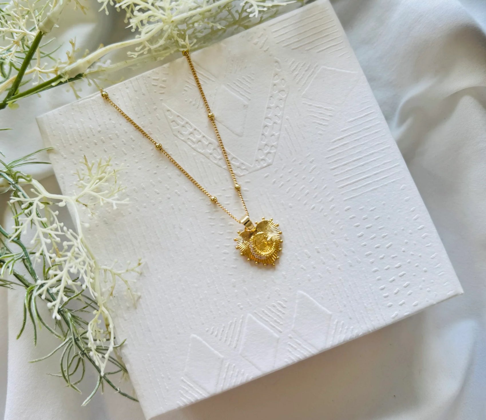 This Sacred Heart Necklace features a stunning diamond moon on a luxurious gold filled chain. Let your inner radiance shine with every step you take with All My Stars and Moons necklace. The focal point of this necklace, the sacred heart pendant, adds a touch of elegance to any outfit. Elevate your style and exude sophistication with this unique and exclusive necklace.