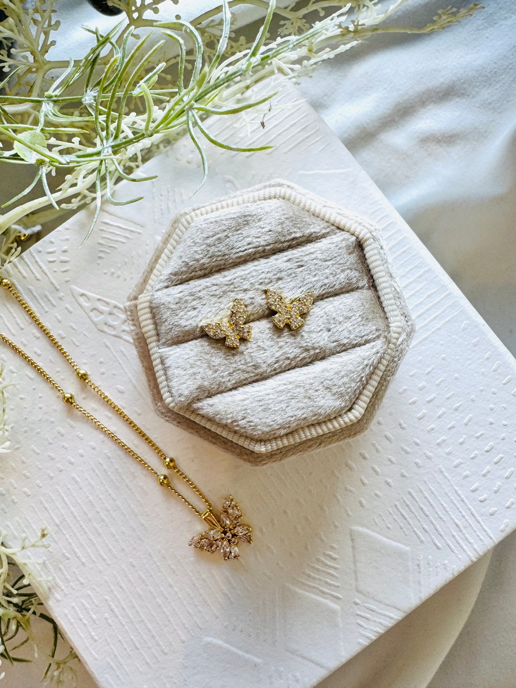 Elevate your everyday look with our Flutter Studs. Crafted with sparkling CZ diamonds and gold filled accents, these butterfly studs exude luxury and sophistication. The stainless steel posts ensure lasting quality. Make a statement with these exclusive, art-inspired earrings.